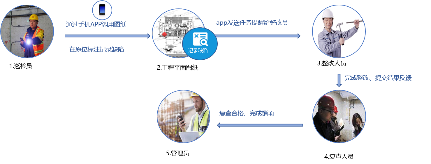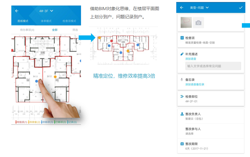 檢查人員到達(dá)現(xiàn)場后使用APP即時調(diào)出工程平面圖紙,在原位標(biāo)注檢查并記錄缺陷,完成后派發(fā)給負(fù)責(zé)人通知其整改。