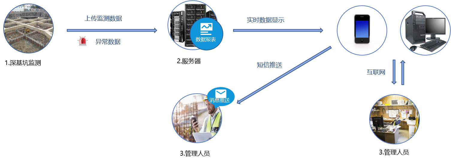 通過安裝傳感器與傳輸裝置對(duì)支護(hù)結(jié)構(gòu)、地表沉降、圍護(hù)樁傾斜等實(shí)時(shí)在線監(jiān)測(cè),實(shí)時(shí)掌握建筑基坑的結(jié)構(gòu)變化。建立多級(jí)報(bào)警機(jī)制,發(fā)現(xiàn)監(jiān)測(cè)數(shù)據(jù)異常時(shí)即時(shí)向用戶推送報(bào)警通知,監(jiān)測(cè)結(jié)果進(jìn)行實(shí)時(shí)顯示發(fā)布,并定期向用戶推送監(jiān)測(cè)報(bào)表,從專家系統(tǒng)中提取處理辦法采取措施介入,對(duì)基坑施工期的監(jiān)測(cè)數(shù)據(jù)分析與安全評(píng)估,實(shí)現(xiàn)結(jié)構(gòu)穩(wěn)定性趨勢(shì)分析。